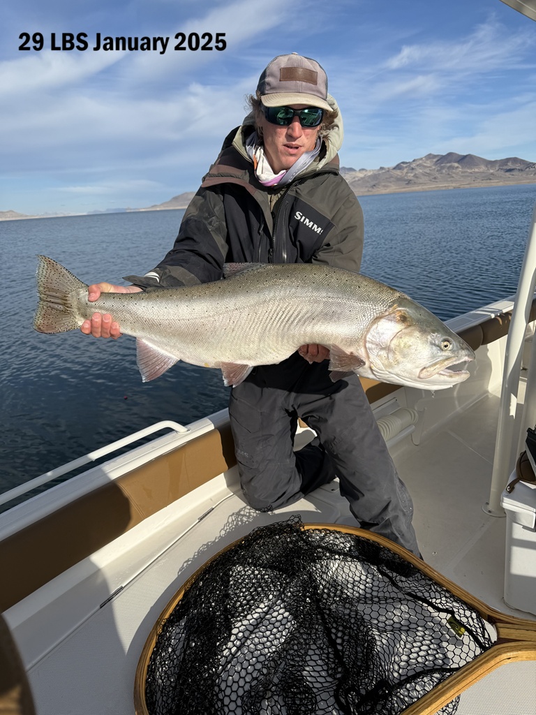 During a guided trip with Hans Grotewold in January 2025, anglers landed an extraordinary 29-pound Lahontan cutthroat trout (pictured above), highlighting the remarkable trophy potential of this unique fishery.